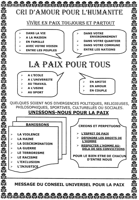 Pour renforcer la paix dans le monde à tout le niveau, le CULPAC publiera ses affiches dans plusieurs langues et lance un appel à tous ceux qui sont intéressés de lui apporter son concours pour une civilisation de la paix à travers le monde pour confirmer son slogan : « EST CIVILISÉ CELUI QUI RESPECTE L’AUTRE ».